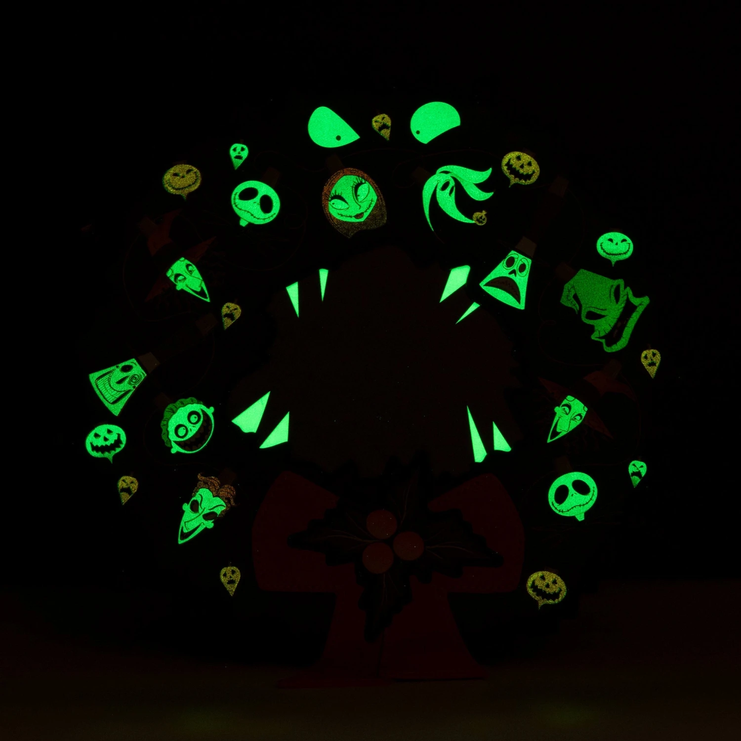 - Applique, debossed, glow-in-the-dark, and printed details in the shape of a Christmas wreath