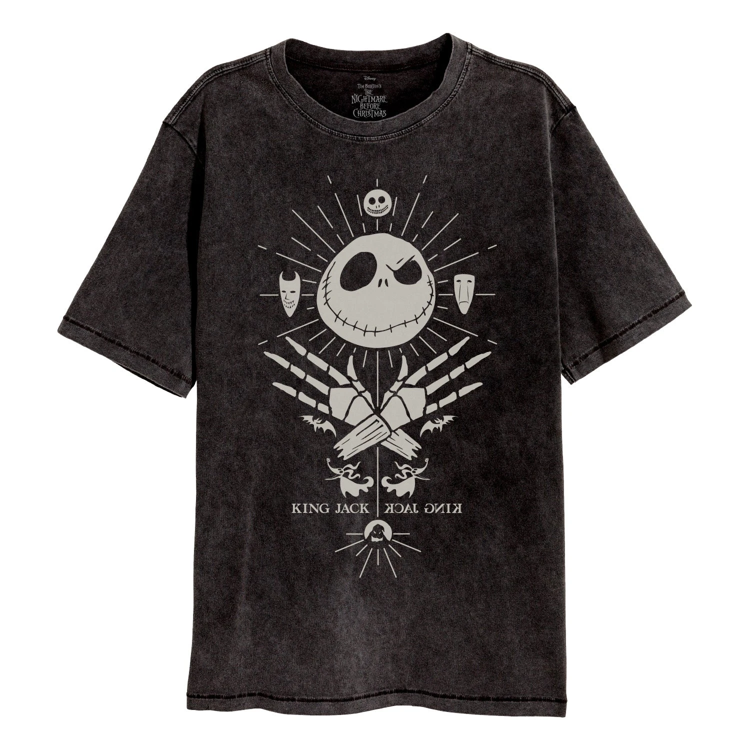 Officially Licensed Nightmare Before Christmas merchandise. This acid wash T-shirt features an iconic design, printed on a 100% cotton acid wash unisex T-shirt. 30% degrees wash