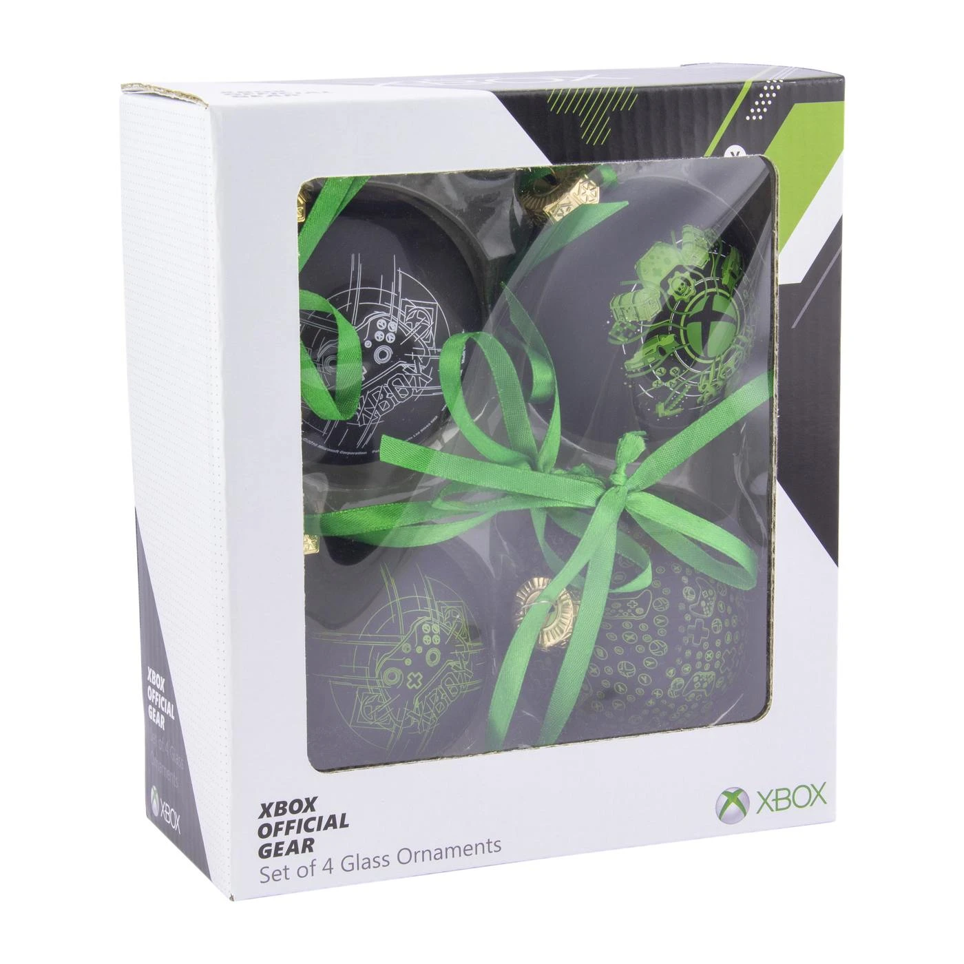 This set of four, officially licensed baubles is made of glass with a black base colour and each one decorated in a different colour with highly detailed, Xbox logo and related graphics. The gold-tone caps hold in place the hanging loop and the look is completed by a green ribbon, tied in a bow.