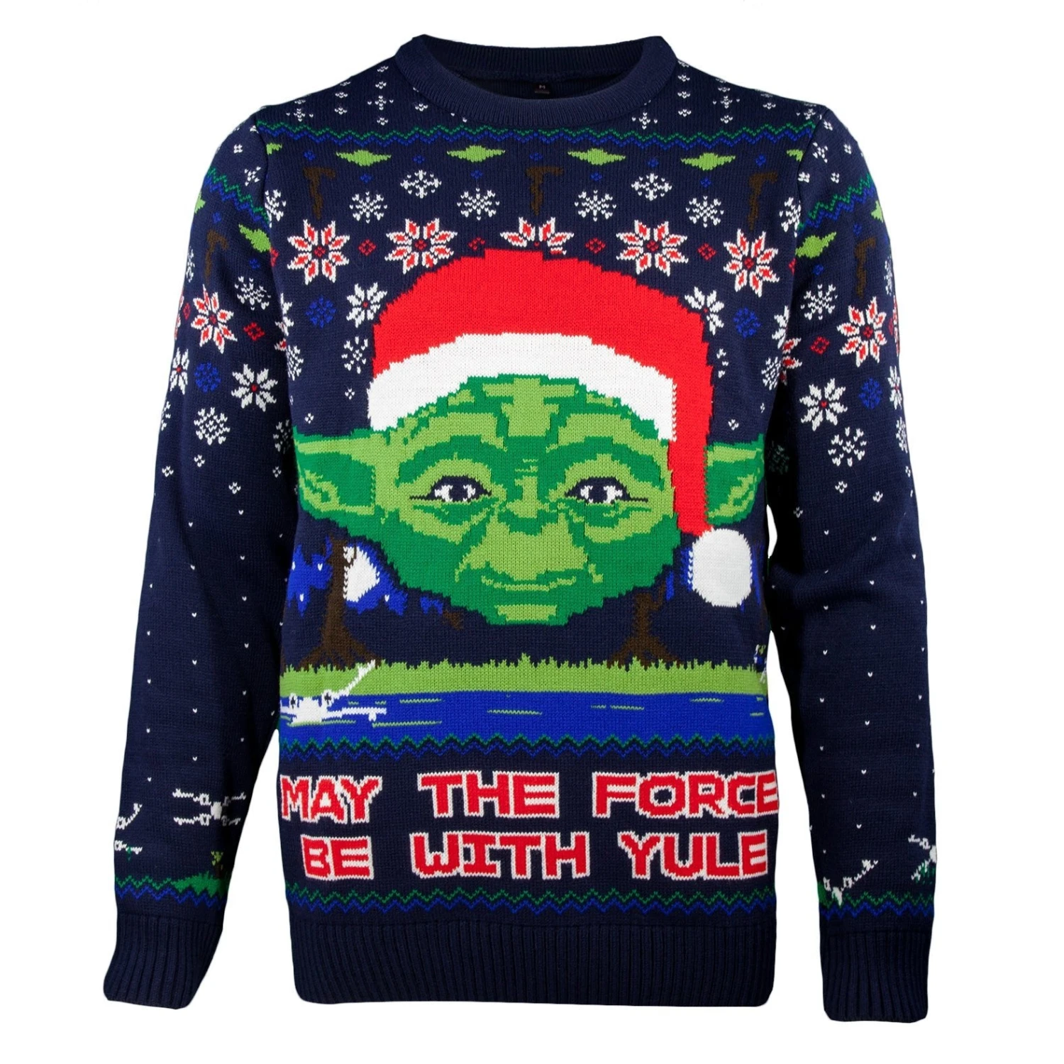 Feel at one with the force this festive season by showcasing this superb Christmas jumper complete with the Jedi master himself wearing a little Santa hat. In the background the Dagobah scene is knitted in all its full glory, featuring a submerged X-wing and an adorable Yoda perched on Luke’s back. A small R2-D2 can be seen trailing behind.